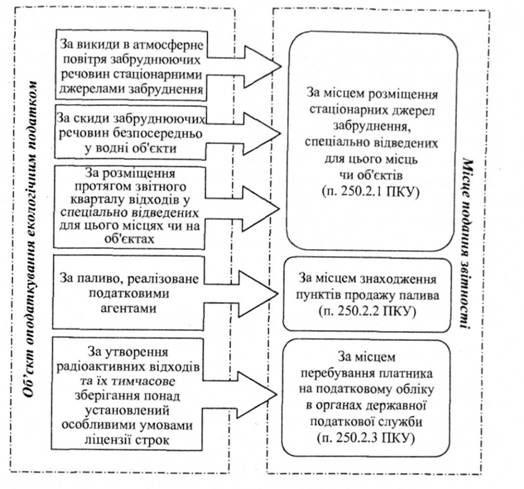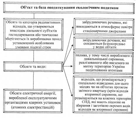 З набранням чинності Податкового кодексу України, з 1 січня 2011 року, загальнодержавний збір за забруднення навколишнього природного середовища замінено екологічним податком (розділ VIII "Екологічний податок" ПКУ). Платниками екологічного податку відповідно до п. 240.1 Податкового кодексу України є суб'єкти господарювання, юридичні особи, які не здійснюють підприємницьку діяльність, бюджетні установи, громадські та інші підприємства, установи та організації, постійні представництва нерезидентів, включаючи тих, які виконують агентські (представницькі) функції стосовно таких нерезидентів або їх засновників, під час провадження діяльності яких на території України і в межах її континентального шельфу та морської економічної зони здійснюються (рис. 7.8): - викиди забруднюючих речовин в атмосферне повітря стаціонарними джерелами забруднення; - викиди забруднюючих речовин в атмосферу пересувними джерелами забруднення у разі використання ними палива (у цьому випадку до загального переліку платників додаються громадяни України, іноземці та особи без громадянства (п. 240.2 ПКУ)); - скиди забруднюючих речовин безпосередньо у водні об'єкти; - розміщення відходів у спеціально відведених для цього місцях чи на об'єктах, крім розміщення окремих видів відходів як вторинної сировини; - утворення радіоактивних відходів (включаючи вже накопичені); - тимчасове зберігання радіоактивних відходів їх виробниками понад установлений особливими умовами ліцензії строк. Перелік суб'єктів підприємницької діяльності, які не є платниками екологічного податку: 1. Не є платниками податку за утворення радіоактивних відходів (включаючи вже накопичені) суб'єкти діяльності у сфері використання ядерної енергії, які (п. 240.3 ПКУ): - до останнього календарного дня звітного кварталу, у якому придбано джерело іонізуючого випромінювання, уклали договір щодо повернення відпрацьованого закритого джерела іонізуючого випромінювання за межі України до підприємства - виробника такого джерела; - здійснюють поводження з радіоактивними відходами, що утворилися внаслідок Чорнобильської катастрофи, в частині діяльності, пов'язаної з такими відходами. 2. Не є платниками податку, що справляється за утворення радіоактивних відходів (включаючи вже накопичені) або тимчасове зберігання радіоактивних відходів їх виробниками понад установлений особливими умовами ліцензії строк, державні спеціалізовані підприємства з поводження з радіоактивними відходами, основною діяльністю яких є зберігання, переробка та захоронення тих радіоактивних відходів, що знаходяться у власності держави, а також дезактивація радіаційно-забруднених об'єктів (п. 240.4 ПКУ). 3. Не є платниками податку за розміщення відходів у спеціально відведених для цього місцях чи на об'єктах суб'єкти господарювання, які мають ліцензію на збирання і заготівлю відходів як вторинної сировини, провадять статутну діяльність із збирання і заготівлі таких відходів, що розміщуються на власних територіях, та надають послуги у цій сфері (п. 240.5 ПКУ). Екологічний податок, що справляється за викиди в атмосферне повітря забруднюючих речовин пересувними джерелами забруднення, у разі використання палива утримується та сплачується до бюджету податковими агентами. Об'єкт та база оподаткування екологічним податком визначені ст. 242 
