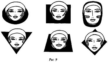 Овальное лицо полно гармонии, имеет форму, приближённую к идеальной. Большие исправления тут не нужны. Достаточно выровнять лицо тональным кремом, подчеркнуть естественный рисунок бровей и наложить румяна в форме треугольника на скулах, слегка растушёвывая в направлении виска. На губы кисточкой нанести помаду. Круглое лицо – горизонтальные и вертикальные размеры лица приближаются друг к другу. Области висков, нижней челюсти и подбородка имеют округлые, мягкие очертания. Коррекция – вытянуть лицо, зрительно уменьшить объём щёк. На всю боковую поверхность лица (виски, щёки) наносится тёмный тон (более тёмная крем-пудра). Румяна располагаются на скулах в виде треугольника, вытянутого к углам рта. Бровям придаётся правильная форма. Контуры губ округлены (рис. 9). Квадратное лицо – имеет развёрнутые углы нижней челюсти, прямоугольные очертания верхней и нижней частей лица. Коррекция заключается в нанесении тёмного тона на углы и прямые черты по контуру лица и на боковые части лба. На середину лба и подбородка нанесён светлый блик. Румяна наносятся на скулы в форме треугольника, вытянутого в сторону висков. Брови должны иметь треугольную форму, вытянутую к вискам. Контуры губ слегка округлены. Треугольное лицо – широкое в области лба и скул и суженное к подбородку. Коррекция – зрительно уравновесить верхнюю часть лица с узкой нижней. Тёмный тон наносится на боковую поверхность скул и висков и на подбородок. На боковую область челюстей наносится немного светлого тона. Румяна наносятся чуть выше скул на выступающую часть. Брови лучше выпрямить. Губы трапециевидной формы слегка округлить. Трапециевидное лицо – характеризует выраженные углы нижней челюсти. Верхняя часть лица значительно уже нижней. Коррекция заключается в том, чтобы затемнить нижнюю часть подбородка и челюстей и высветлить углы лба. Румяна накладываются на скулы горизонтально в форме прямоугольника и растушёвываются к вискам. Бровям придаётся форма крыльев. Форма губ угловатая, слегка закруглённая. Удлинённое лицо – отличается высоким лбом и вытянутым подбородком. Длина лица намного превосходит ширину. Коррекция заключается в затемнении подбородка и высокого лба. Румяна наносятся на среднюю часть щёк в виде лежащего овала, и их необходимо растушевать горизонтально. Брови чуть спрямляются. Губы округляются. Ромбовидное лицо имеет широкие скулы, сужено в верхней и нижней части лица. Коррекция – смягчить угловатые части лица. Наносится тёмный тон на выпуклые части скул и немного светлого тона – на впадины в области висков и под скулами. Румяна наносятся на выступающую часть скул в форме треугольника с растушёвкой к вискам. Бровям придаётся форма крыла. Губы трапециевидной формы слегка округлены (рис. 9).