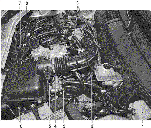 Расположение элементов системы охлаждения (рис.1): 1 –расширительный бачок; 2 – шланги отопителя; 3 – термостат; 4 –датчик указателя температуры охлаждающей жидкости (на фото не виден, расположен под термостатом); 5 – датчик температуры охлаждающей жидкости; 6 – шланги радиатора; 7 – пробка сливного отверстия радиатора; 8 – пробка сливного отверстия блока цилиндров; 9 –шланги подогрева дроссельного узла.
