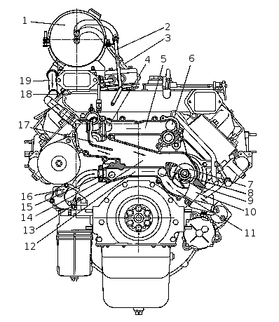 Схема системы охлаждения (рис.1): 1 — расширительный бачок; 2 — пароотводящая трубка; 3 — трубка отвода жидкости из компрессора; 4 — канал выхода жидкости из правого ряда головок цилиндров; 5 — соединительный канал; 6 — канал выхода жидкости из левого ряда головок цилиндров; 7 — входная полость водяного насоса; 8 — водяной насос; 9 — канал входа жидкости в левый ряд гильз цилиндров;10 — канал подвода жидкости в водяной насос из радиатора; 11 — выходная полость водяного насоса; 12 — соединительный канал; 13 — перепускной канал из водяной коробки на вход водяного насоса; 14 — канал входа жидкости в правый ряд гильз цилиндров; 15 — канал отвода жидкости в теплообменник масляный; 16 — теплообменник масляный; 17 — водяная коробка; 18 — трубка подвода жидкости в компрессор; 19 — перепускная труба.