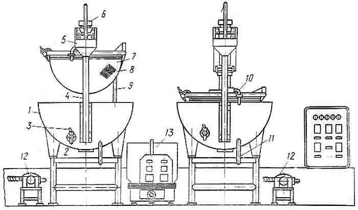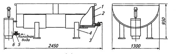 Рис.1 - Ванна ИПКС - 021 Ванна состоит из корпуса 1,выполненного в виде полуцилиндра, теплообменной рубашки 2, выносного водогрейного котла 6 со встроенными водонагревательными элементами, шаровых кранов 5 для подачи холодной воды и 3 для выпуска сыворотки и опор 4. После внесения закваски, хлорида кальция, необходимого для восстановления солевого равновесия пастеризованного молока, а также сычужного фермента продукт перемешивают и оставляют в покое до окончания сквашивания. Требуемая температура сквашивания молока обеспечивается выносным водогрейным котлом 6, из которого нагретая до температуры 32 °С вода направляется в теплообменную рубашку 2. Продолжительность сквашивания молока в ванне составляет 6...8 ч (при температуре 32 °С), при ускорен-ном способе — 4...4,5 ч (при температуре 35...38 °С). После сквашивания молока образовавшийся в ванне сгусток раскладывается в мешки из лавсановой ткани, которые помещаются в пресс-тележку для отделения сыворотки. Техническая характеристика ванны ИПКС-021 Вместимость, л...............................................................1000 Продолжительность нагрева продукта до температуры сквашивания, мин..................................................60 Диаметр сливного отверстия, мм...................................50 Установленная мощность, кВт.......................................36 Габаритные размеры, мм......................................2450x1300x950 Масса, кг.........................................................................350