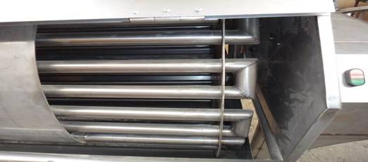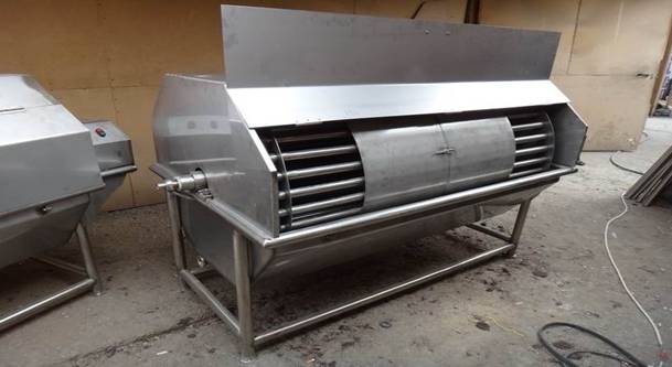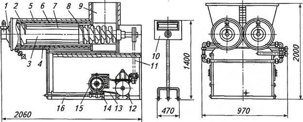 Закрытый двухцилиндровый охладитель творога ОТД (рис. 4) предназначен для охлаждения творога до температуры 8... 10 ºС. Состоит из двух закрытых цилиндров 5 с общим бункером 9, укрепленным на станине 16. Цилиндры снабжены рубашками 4 с винтовым ходом для охлаждающей жидкости. Спереди цилиндры закрыты коническими крышками 1 с отверстиями для выхода охлажденного творога, снаружи цилиндры закрыты металлическим кожухом. В цилиндрах расположены вытеснительные барабаны 3, имеющие на поверхности в передней части по два витка шнека 2. В средней части барабанов на шарнирах закреплены два ножа 7 из полимерного материала для срезания творога с внутренней поверхности цилиндров. В бункере 9 имеются валы со шнековыми питателями 8. Вращение вытеснительных барабанов 3 осуществляется от электродвигателя 15 через приводной механизм, состоящий из клиноременной передачи 13, вариатора 14, червячного редуктора 12 и двух цепных передач 11. Творог подается в приемный бункер 9, из которого захватывается конической частью шнековых питателей 8 и подается в пространство между цилиндром 5 и вытеснительным барабаном 3. Вдоль цилиндра творог проталкивается и перемешивается шнеком цилиндрической части барабана. Перемещаясь вдоль цилиндра, творог при помощи змеевика 6 охлаждается ледяной водой с двух сторон через стенки цилиндра 5 и вытеснительного барабана 3, зазор между которыми составляет 8 мм. Ледяная вода подается в направлении, обратном движению творога. Аппарат снабжен пультом 10.