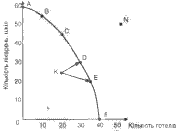 Умови ефективного використання ресурсів. Найефективніше комбінування ресурсів (їх найраціональніше використання) можливе також за умови їх повної зайнятості (економічного використання у виробництві всіх придатних ресурсів) та повних обсягів виробництва (максимально можливих обсягів виробництва за даного рівня розвитку техніки і технології, а також при повній зайнятості ресурсів за умови їх використання на виробничі цілі).Похідним від поняття "економічна ефективність" є поняття "зрівняльна перевага", тобто здатність товаровиробника виготовляти товари з меншими альтернативними витратами. Відповідно до неї підприємець повинен віднайти такий вид діяльності у певній галузі, де він мав би зрівняльну перевагу. Проілюструємо механізм вибору альтернативних варіантів використання ресурсів (табл. 1). Якщо ресурси використовуються для будівництва лікарень, шкіл, то їх вартісна (грошова) оцінка складається із витрат на матеріали, робочу силу, оренду або купівлю землі. Альтернативними витратами щодо них є витрати на будівництво готелів, офісів, які можуть бути збудовані за рахунок тих самих ресурсів. Уряд може спрямувати всі ресурси на будівництво лікарень або частку цих коштів — на будівництво готелів. Це означає, що обсяги будівництва названих різних об'єктів є не лише альтернативними, а й взаємодоповнюваними. Крива виробничих можливостей. Щоб чіткіше уявити значення альтернативних можливостей об'єктів, побудуємо графік меж виробничих можливостей (мал. 1). Якщо нанести цифри на графік, отримаємо точки, які показують варіанти вибору ресурсів. З'єднавши їх, одержимо криву виробничих можливостей. Рухаючись по кривій, маємо можливість спостерігати різні варіанти у комбінації ресурсів. Так, у точці В ресурси поділяються так, що на них можна побудувати 55 лікарень, шкіл і 10 готелів. Якщо ресурси розподілити так, що виробництво здійснюється у межах виробничих можливостей (точки А, В, С, Д, Е, /), то досягаються найвища ефективність економіки і правильність вибору. У цьому разі точка К свідчить про недостатньо ефективне використання виробничих можливостей, а точка N знаходиться поза межею таких можливостей, отже є нереальною за даного рівня розвитку техніки, технології, організації виробництва тощо. Тому зміщення кривої виробничих можливостей вліво свідчить про їх зростаюче невикористання. Свого максимуму воно досягає під час економічних криз.