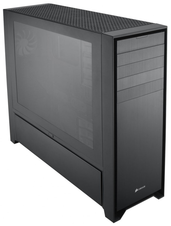 Да-да, Obsidian 900D поддерживает установку сразу двух «кормушек», как это зачастую практикуется в ультрамощных конфигурациях. Крепятся они вертикально к задней стенке. В этом же отсеке расположены две корзины для жестких дисков, которые при необходимости можно снять, если они мешают установке радиаторов СЖО. Всего допускается установка 9 накопителей, причем эту цифру можно увеличить до 15, если приобрести еще две корзины как дополнительную опцию. Корпус совместим с материнскими платами форм-фактора ATX, E-ATX, HPTX, microATX и Mini-ITX, то есть реализована поддержка двухпроцессорных решений. Стоит обратить внимание, что у Corsair 900D предусмотрена удобная система прокладки кабелей, которую обязательно оценят как новички, так и профессиональные сборщики. Система охлаждения может похвастаться наличием 15 посадочных мест для вентиляторов, 7 точек крепления радиаторов и 4 сменных пылевых фильтров. В комплект по умолчанию уже входят три 120-мм «карлсона» на передней панели и один 140-мм на задней стенке, работающий на выдув. Для 5.25-дюймовых устройств предусмотрено целых четыре лотка в верхней корзине, где можно, помимо оптического привода, разместить пару реобасов или жидкостный резервуар для полноценной «водянки». На панели ввода/вывода имеются все необходимые интерфейсы, кнопки и средства индикации, а недостаток eSATA компенсируется наличием hot-swap для быстрой замены жестких дисков.