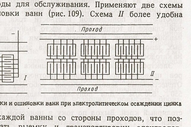 Для электроосаждение цинка применяется полимербетонная ванна, армированная стеклопластиковыми прутками. Бетонный раствор готовится из кислотостойких инертных материалов. В качестве связующего применяется фурановая смола (4ФА). Внутренние размеры ванны из полимербетона: длина 2400 мм, ширина 950 мм, глубина 1475 мм; наружные размеры: длина 2600 мм, ширина 1130 мм, высота 1650 мм. Общая емкость ванн составляет 2,7 м3, полезная емкость 2,6 м3. Ванны распологают в цехе по схеме, в которой ванны сргуппированны по 20 шт в ряды (рисунок 9). Между ваннами имеются проходы для обслуживания.