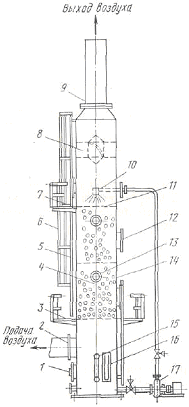 Рисунок 10 – Турбулентный контактный абсорбер (ТКА) электролита: 1 – люк; 2 – входное отверстие; 3 – первая площадка; 4 – шары из пластмассы; 5 – лестница; 6 – лестничная клетка; 7 – вторая площадка; 8 – каплеуловитель; 9 – выходное отверстие; 10 – форсунка для электролита; 11 – решетка; 12 – люк: 13 – смотровое окно; 14 – корпус; 15 – индикатор уровня жидкости; 16 – манометр; 17 – насос. Температура нейтрального раствора на входе в охладитель составляет 45-55° С, отработанного электролита 38° С, смеси растворов, поступающих на электролиз 33° С. Для отсоединения катодного цинка от катодов применяется ручная сдирка цинка, которая ведется в дневную смену. Процесс ручной сдирки состоит из операции снятия цинкового осадка с катодов и обслуживания ванн и электродов в период сдирки. Обе операции выполняют наиболее квалифицированные рабочие - катодчики. Ежедневно из каждой электролизной ванны вручную, пневматическим подъемником вынимается несколько катодов (от 3 до 7) с наращенным на них осадком цинка. Чем больше число одновременно поднятых за один прием катодов, тем более значительные потери электроэнергии при системе непосредственного контакта анод - катод, так как в это время на катодах в соседних ваннах происходит обратное растворение цинка. С поднятых катодов стекает электролит и затем снимается цинковый осадок на свободной площадке цеха электролиза. Сдирка цинка производит с обеих сторон катода вручную с помощью специального ножа, при этом предварительно отгибается резиновая бортовая планка. Содранный с катодов цинк укладывается на тележки и доставляется электрокарами в плавильное отделение, а алюминиевые катоды устанавливают на свое место в ванне [4].