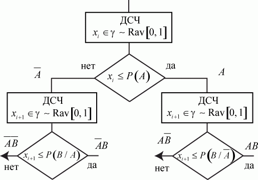 Пример 3.10. В ремонтное подразделение поступают вышедшие из строя средства связи (СС). В каждом СС могут быть неисправными в любом сочетании блоки A, B, C. Вероятности выхода из строя блоков Построить алгоритм имитационной модели с целью определения абсолютного и относительного количества отремонтированных СС с неисправными блоками A, B, C и A, B из общего количества R поступивших в ремонт СС. Решение Для имитации неисправных блоков СС и имитации наличия исправных блоков в ремонтном подразделении воспользуемся способом определения по жребию. Для этого рассчитаем вероятности исходов и сведем их в табл. 3.5 и 3.6 соответственно.