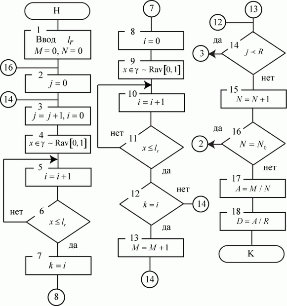 Так как нужно определить абсолютное и относительное количества отремонтированных СС, поступивших с неисправными блоками A, B и A, B, C, то нет смысла рассчитывать вероятности для других сочетаний неисправных и исправных блоков. Алгоритм имитационной модели приведен на рис. 3.19. В алгоритме приняты следующие обозначения: