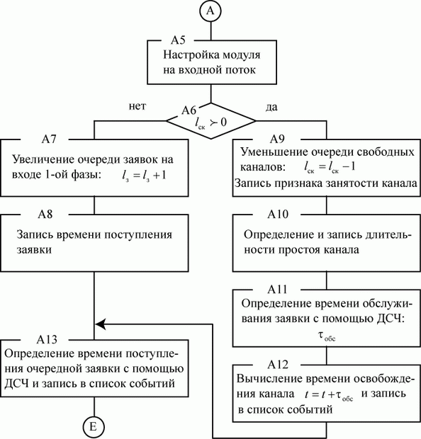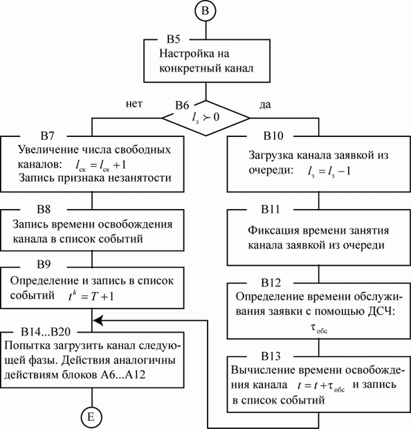 Блок В5 -настройка модуля на освободившийся канал конкретной фазы. Каждая фаза обслуживания имеет свою очередь заявок на входе, свою очередь свободных каналов и, возможно, свои датчики случайных чисел. Поэтому не будем вводить для них новые обозначения, оставим те, которые были использованы при описании модуля А. Блок В6. Проверка: есть ли в очереди на входе фазы заявки, ожидающие обслуживания ( канал должен быть немедленно загружен (блоки 10… 13). Если нет, то канал должен быть переведен в режим ожидания (блоки В7…В9). Блок В7. Очередь свободных каналов увеличивается на Блок В8. Запоминание момента освобождения канала. Блок В9. Перевод освободившегося канала в пассивное состояние. Для этого пространственно-временной точке превышающего интервал исследования Блоки В14…В20 моделируют размещение заявки, освободившей канал, в следующей фазе обслуживания. Функции и взаимные связи этих блоков аналогичны блокам А6 … А12, рассмотренным ранее:
