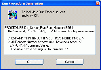 В диалоговом окне Screening Experiment Generator (Генератор отсеивающего эксперимента) в группе Fraction (Часть дробного эксперимента) установите Full (ПФЭ). Под Run Count появится число 8. Обратите внимание, что кнопка Alias Groups (Группы смешивания) при установке полного факторного эксперимента Full (ПФЭ) не будет активной. Теперь необходимо создать Plus - операторы и вставить их в нижнюю часть модели Прямая задача. Для этого нажмите кнопку Insert Experiment (Вставить эксперимент), расположенную в левой нижней части диалогового окна Screening Experiment Generator (Генератор отсеивающего эксперимента). Так как была выбрана опция Generate Run Procedure, то создана стандартная процедура запуска. Появится ее диалоговое окно, дающее возможность пользователю изменить процедуру запуска согласно своим требованиям. Введите через пробел после слова PROCEDURE указанное ранее имя процедуры Dis_Server_Run, оставив в скобках (Run_Number), без изменения (рис. 7.4). Перейдите, пользуясь клавишами вверх-вниз, в конец процедуры запуска. Там в разделе Set up your own run conditions (Задайте свои условия наблюдения) имеются две команды START, между которыми находится команда RESET (рис. 7.5). Поясним назначение этих команд. Для получения достоверной статистики существуют три подхода (см. п. 4.9). В генераторе экспериментов использован третий подход.