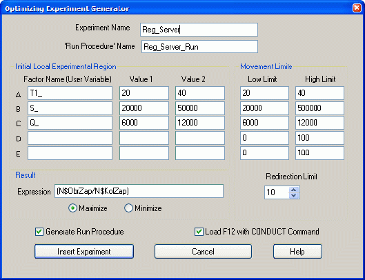 где Оптимизация многофакторного, особенно нелинейного уравнения регрессии, задача не простая, и для ее решения разработан ряд численных методов. Наиболее эффективен при компьютерном моделировании так называемый метод поверхностей, при котором уравнение регрессии трактуется как уравнение поверхности в многофакторном пространстве. Оптимальное решение в этом случае составляют координаты из значений факторов вершины (или впадины) этой поверхности. Поиск оптимума осуществляется последовательными изменениями (шагами) значений уровней факторов в направлении, на котором обнаруживается улучшение показателя эффективности. Такой метод реализован в GPSS World. Пользователь задает исходные условия, а GPSS World автоматически создает план и проводит с поверхностью отклика эксперимент, который отыскивает оптимальное значение. В ходе эксперимента GPSS World пытается подобрать либо линейную модель, либо модель второго порядка (включая двухфакторные взаимодействия). Рассмотрим на примере проведение регрессионного анализа (оптимизирующего эксперимента). Пример 7.2. В условиях примера 6.1 провести регрессионный анализ результатов моделирования. При этом вычислительную сложность обработки запросов сервером взять распределенной не по нормальному, а по экспоненциальному закону, т. е. в программе модели примера 6.1 удалить строку S2_ EQU 200000; Стандартное отклонение вычислительной сложности запросов, оп а строку с блоком ADVANCE заменить строкой: ADVANCE ((Exponential(32,0,S_))/Q_); Имитация обработки запроса Откройте модель примера 6.1. Сохраните как Reg_Server. Внесите рекомендованные изменения. Выберите Edit / Insert Experiment / Optimising … (Правка / вставить эксперимент / Оптимизирующий …). Откроется диалоговое окно Optimizing Experiment Generator (Генератор оптимизирующего эксперимента). Введите имена факторов и значения уровней (рис. 7.10). В поле Expression (Выражение) группы Result (Результат) введите выражение, по которому рассчитывается результат наблюдения: (N$ObrZap/N$KolZap) Оптимизирующий эксперимент нужно ограничить пределами. Группа полей Movement (Пределы перемещения) позволяет ограничить перемещение локальной экспериментальной области. Если это возможно, необходимо ввести пределы изменения для каждого фактора эксперимента. Другой способ ограничить поиск - задание величины Redirection Limit (Предел изменения направления). Это значение устанавливает предел на количество изменений направления движения эксперимента по факторному пространству. Введите в поля эти данные, приведенные на рис. 7.10.