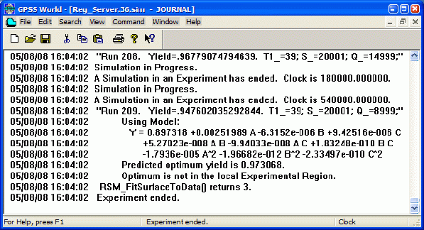 После такого сообщения нажмите функциональную клавишу [ F12 ]. Эксперимент начнет выполняться. В окно Journal (Журнал) процесса моделирования будут выводиться отчеты о состоянии и результатах каждого наблюдения. По отчетам можно узнать о перемещении локальной экспериментальной области. Plus-эксперимент пытается переместить локальную экспериментальную область так, чтобы она включала в себя оптимальные условия. Если это происходит, или, если достигнут предел изменения направления или предел перемещения, эксперимент заканчивается. Когда перемещение останавливается, в окно Journal (Журнал) также выводятся результаты проверки критерия адекватности и уравнение подобранной (найденной) поверхности отклика. Затем, если это еще не сделано, Plus-эксперимент пытается проверить прогнозируемые оптимальные условия, запустив процесс моделирования для них. Результаты регрессионного анализа (оптимизирующего эксперимента), после 209 наблюдений, приведены на рис. 7.12. Заметим, что это на 201 наблюдение больше, чем при проведении дисперсионного анализа (отсеивающего эксперимента) (п. 7.1). Оптимум не находится в локальной экспериментальной области.