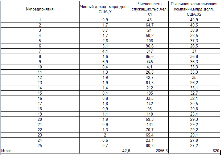 Пример задания по теме Корреляционный анализ Корреляционный анализ изучает стохастические связи между случайными величинами в экономике. Метод корреляции применяется для того, чтобы при сложном взаимодействии посторонних влияний выявить зависимость между результатом и факторами в том случае, если посторонние факторы не изменялись и не искажали основную зависимость. При этом число наблюдений должно быть достаточно велико, так как малое число наблюдений не позволяет обнаружить закономерность связи. Укрупненно можно рекомендовать: число наблюдений равно восьмикратному числу факторов, включенных в модель. Задание: 1.) Построить корреляционное поле зависимости между y и x1. Сделать вывод относительно формы и направления связи. 2.) Построить уравнение регрессии между у и х1 (линейная, степенная, логарифмическая). Оценить каждую функцию через F-критерий, 3.) Построить корреляционное поле зависимости между y и x2. Сделать вывод относительно формы и направления связи. 4.) Построить двухфакторное уравнение регрессии между y, x1,x2. Оценить показатели тесноты связи. 5.) Оценить модель через F-критерий Фишера. 6.) Оценить параметры через t-критерий Стьюдента. Исходные данные: