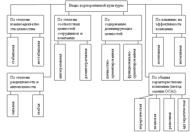 Явление организационной культуры существовало всегда, независимо от того, осознавали это или нет ее носители. Важнейшей особенностью управления современной компанией как социальной системой является непрерывный поиск продуктивного компромисса между интересами предприятия и интересами человека. Формирование регламентов или бизнес-правил должно быть дополнено формированием желания персонала их принять и выполнять. Это объективно связано с процессами, происходящими в цивилизованном обществе. В России при отсутствии крупных инвестиций в промышленность и жесткой конкуренции с западными компаниями возможности повышения эффективности связаны с изысканием новых ресурсов внутри компании. Трансформации, которые происходят сегодня в России — это не столько трансформация экономики, сколько трансформация типа культуры, существующей в обществе. Актуальность этой проблемы очевидна в современных российских условиях функционирования организаций. Без изменения существующей корпоративной культуры на предприятиях со старыми ценностями, такими как дисциплина, послушание, иерархия и власть, зачастую невозможно создание новой системы управления с другими ценностями — участие, раскрытие личности и индивидуальный подход к личности сотрудника, творческое мышление, словом такими, обладание которыми считается важнейшим требованием для организаций XXI века. В России, такое понятие как корпоративная культура появилось лишь в конце XX века. Многие управляющие очень слабо представляют себе сущность такой важной составляющей любой организации. Корпоративная культура и ее влияние на деятельность организации В рамках организаций возникло понятие «корпоративная культура», которое как и многие другие термины организационно-правовых дисциплин не имеет единого толкования. Приведем наиболее полное определение, данное Спиваком В.А. Корпоративная культура — это система материальных и духовных ценностей, проявлений, взаимодействующих между собой, присущих данной корпорации, отражающих ее индивидуальность и восприятие себя и других в социальной и вещественной среде, проявляющееся в поведении, взаимодействии, восприятии себя и окружающей среды. Абрамова С.Г. и Костенчук И.А. предлагают следующую классификацию, посредством которой они выделяют различные виды корпоративной культуры (рис. 1): 1) по степени взаимоадекватности доминирующей иерархии ценностей и преобладающих способов их реализации выделяют стабильные (высокая степень адекватности) и нестабильные (низкая степень адекватности) культуры. Стабильная культура характеризуется отчетливо заданными нормами поведения и традициями. Нестабильная — отсутствием четких представлений об оптимальном, допустимом и недопустимом поведении, а также колебаниями социально-психологического статуса работников.