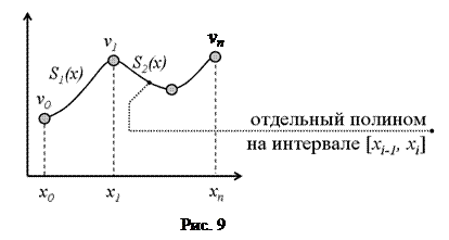 Для решения первой задачи используется методы кусочно-линейной аппроксимации и аппроксимации сплайнами. Кусочно-линейная аппроксимация получается соединением узлов отрезками прямых линий. Узлы располагаются так, чтобы обеспечить наименьшую ошибку между аппроксимирующей и точной функцией. Чаще используют аппроксимацию сплайнами. В отличие от интерполяции полиномом, которым описывается вся область данных, при интерполяции сплайнами строится отдельный полином, описывающий интервал от узла xi-1 до узла xi (см. рис. 9).