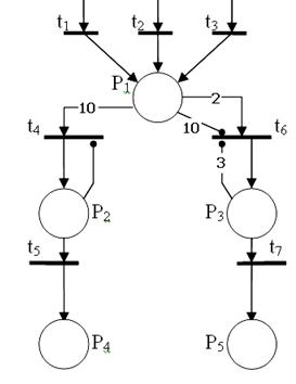 Для моделирования средств вычислительной техники и процессов обработки информации используются разновидности сетей Петри, различающиеся способами разрешения конфликтов. В стохастических сетях Петри дополнительно вводятся случайные задержки или вероятности срабатывания активных переходов. В примере на рис. 21-а сработает либо переход t1 (c вероятностью р1), либо t2 (c вероятностью 1 -р1). В приоритетных сетях конфликтные ситуации разрешаются введением различных приоритетов для ветвей. Конфликт, показанный в примере на рис. 21-б, всегда будет разрешаться в пользу перехода t1, так как он имеет приоритет, а переход t2 сможет сработать только в том случае, если, при наличии меток в вершинах Р2 и Р3, метки в вершине Р1 не окажется.