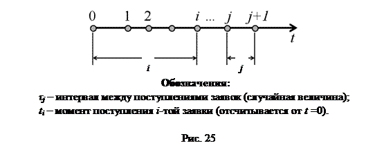 где l – интенсивность поступления заявок (параметр экспоненциального распределения), положительная постоянная величина, обратная МО времени поступления. На оси времени поток поступления заявок можно изобразить, как показано на рис. 25.