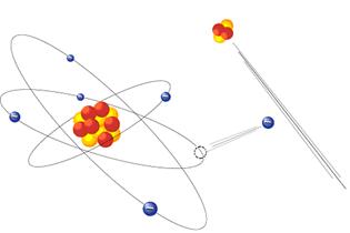 Рис. 1. Альфа-излучение Ионизация вещества альфа-частицей На рисунке 2 альфа-частица проходит близко от атома. Когда α-частица проходит в непосредственной близости от электрона, она притягивает его и может вырвать с нормальной орбиты. Атом теряет электрон и таким образом преобразуется в положительно заряженный ион. Так α- частицы обычно ионизируют вещество.