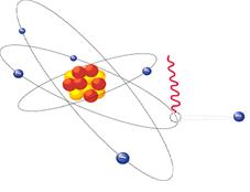 Рис. 7. Испускание атомом g -излучения Ионизация вещества g-излучением g -излучение, проходящее через вещество, имеет возможность ионизировать это вещество, передавая свою энергию электронам атомов, составляющих его. Энергия излучения постепенно уменьшается. Поскольку g -излучение не имеет никакого электрического заряда, его способность ионизировать атомы вещества намного меньше, чем у α- и β- излучения. Воздействие γ- излучения на вещество, приводящее к отрыву электрона от электронной оболочки атома, изображено на рис. 8.