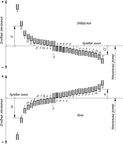1. Можно применять любое сочетание полей допусков, установленных стандартом. 2. Посадки должны назначаться либо в системе отверстия, либо в системе вала. 3. Применение системы отверстия предпочтительней. 4. Следует отдавать предпочтение рекомендуемым посадкам (см. ГОСТ 25347-82), при этом в первую очередь - предпочтительным. 5. Посадки с 4-го по 7-й квалитеты рекомендуется образовывать путем сопряжения отверстия на квалитет грубее, чем вал. Отверстия при прочих равных условиях изготавливаются с большими погрешностями, чем валы, поэтому и допуск посадки делится не поровну, большая часть отдается отверстию, меньшая - валу. В ЕСДП поле допуска образуется сочетанием основного отклонения и квалитета. Соответственно условное обозначение поля допуска состоит из буквы (букв) основного отклонения и номера квалитета, например: – поля допусков валов: h6, d8, k7, p9; – поля допусков отверстий: H8, N9, F7, R10. По основному отклонению и допуску определяется второе предельное отклонение, ограничивающее данное поле допуска. Если поле допуска располагается ниже нулевой линии, то основным отклонением является верхнее отклонение, а нижнее определяется по формулам: – для вала: ei = es – IT; (35) – для отверстия: EI = ES – IT. (36)