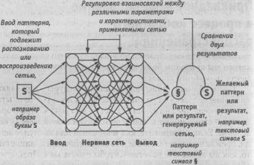 Рис. 34. Схема процесса «обратного распространения» в нервной сети Этот образ кодируется в компьютерной сети как паттерн реакций (основанных на текущем «весе» их взаимосвязей). В результате действия этого паттерна сеть выдает результат, например символ «§». Результат компьютера сравнивается с ожидаемым результатом (т. е. с буквой 5). Если между двумя результатами — ожидаемым 5 и полученным «§» — возникает расхождение, то взаимосвязи между элементами сети регулируются заново. Затем образ буквы вновь вводится в систему, и результат проверяется тем же путем. После некоторого количества повторных проб компьютерный результат начинает все больше и больше напоминать желаемый (т. е. после ввода образа S компьютер выводит текстовый символ 5). Другими словами, компьютер создает полезную «модель»: механизм, позволяющий достичь желаемого результата при вводе определенных данных. Подобная стратегия используется в НЛП для совершенствования той или иной модели, созданной с помощью разнообразных методов и стратегий (описанных выше). Человек представляет собой сложную «нервную сеть», которая способна обрабатывать различные свойства и особенности (т. е. репрезентативные системы, субмодальности, паттерны метапрограммы, микроповеденческие ключи, языковые паттерны и т. д.). Сосредоточение «внимания» на определенной особенности подобна процессу наделения «весом» того или иного элемента компьютерной нервной сети. Например, если сказать человеку «подними глаза вверх и влево», в то время как он пытается научиться правильно писать какое-то слово, то тем самым мы придадим больше «веса» положению глаз как элементу грамотного письма. Таким образом, этапы модели или процедуры надбавляют внимание человека на различные аспекты и черты его опыта. Это перемещение внимания "создает своего рода «аттрактор», который стимулирует в человеке «самоорганизующееся» поведение. Если вы заметите, как теннисный мяч коснулся земли, прежде чем долетел до вас, это автоматически повлияет на то, как вы взмахнете ракеткой, чтобы отбить мяч. Подобным образом, если прислушиваться к изменению тона голоса собеседника, а не к содержанию его слов, или наблюдать его выражение лица, вместо того чтобы обращать внимание на тип одежды, которую он носит, то все эхо повлияет на способ вашей реакции на этого человека. Инструкции и процедуры, составляющие принципы, этапы и стратегии поведенческой модели, таким образом, подобны «весу» в нервной сети. Применение «обратного распространения» в поведенческом моделировании будет включать в себя (рис. 35): 1) попытку применить шаги, стратегии и особенности, определяемые моделью, в соответствующем контексте; 2) концентрацию на достигнутых результатах и сравнение их с желаемыми; 3) регулировку мер и особенностей, предлагаемых моделью, с целью повысить «степень приближения»; 4) попытку применить новые настройки модели и продолжающиеся попытки повторения процесса до тех пор, пока вы (или люди, на которых рассчитана эта модель) не достигнете требуемого «порогового» уровня желаемого результата. С помощью данного механизма модель совершенствуется в процессе опытного применения. Поправки как результаты сравнения реального и желаемого результатов вносятся до тех пор, пока не будет выработана наиболее эффективная и элегантная модель.