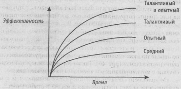 Рис. 40. Лидер вовлекает окружающих в процесс достижения цели в рамках определенной системы Лидерство оказывается более востребованным в бурные периоды социальных преобразований и перемен. 2. Лидерство представляет собой процесс, который, по меньшей мере, частично связан с приобретением навыков. Несмотря на то, что способность к «лидерству» нередко ассоциируется с врожденным талантом, было замечено, что опытный менеджер легче, чем средний менеджер, адаптируется к новым ситуациям лидерства (даже если не обладает природным даром) (рис. 41). Более того, менеджер, обладающий одновременно талантом и опытом, будет более эффективен, чем тот, кто одарен от природы, но не развил в себе необходимых навыков.