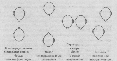 Психогеография относится к тому влиянию, которое оказывают микрогеографическое устройство и взаимоотношения на психологические процессы и межличностные взаимодействия людей. Термин «психогеография» заимствован из области психодрамы и работ Д ж. Морено. Автор ввел этот термин в НЛП в середине 1980-х гг. как элемент своей работы, включавшей использование пространственной классификации в техниках НЛП. «Психогеография» связана с тем фактом, что «географические» отношения между членами какой-либо группы оказывают важное невербальное воздействие на процессы и взаимодействия внутри группы. Пространственные отношения и ориентация между людьми влияют на взаимодействие членов группы как физически, так и символически. Психогеография создает своего рода «сеть» отношений между людьми, определяя тип и качество взаимодействия. Представьте себе простейший случай взаимодействия между двумя людьми (рис. 65). Если они стоят лицом к лицу на близком расстоянии, их психогеография создает и поддерживает непосредственное и настолько же интенсивное взаимодействие между ними (позитивное или негативное). Если эти двое отойдут чуть дальше друг от друга, интенсивность взаимодействия, скорее всего, уменьшится. Если они стоят «бок о. бок», вероятнее всего, общая природа их взаимоотношений и взаимодействия слегка изменится: они будут больше напоминать партнеров или членов одной команды, сконцентрированных на общем направлении или задаче, а не друг на друге. Если человек стоит слегка позади и сбоку от другого человека, он почти наверняка возьмет на себя роль его помощника или наставника.