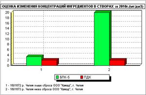 Река Чегем является правобережным притоком реки Баксан. В своём верхнем течении река имеет характер типично горной реки. Контроль гидрохимического состояния реки Чегем в истекшем году осуществлялся в четырёх створах наблюдения: 1) фон – с. Хушто-Сырт; 2) выше сброса сточных вод ООО «Камад»; 3) ниже сброса сточных вод ООО «Камад»; 4) устье - с. Чёрная Речка. Физические свойства и органолептические показатели воды реки удовлетворительные, кроме как в створе ниже сброса сточных вод ООО «Камад», где проявляется сильный гнилостный запах барды в летний период. Концентрация водородных ионов в норме - 8,0 ед. рН, кислородный режим удовлетворительный и в среднем составляет 10,2 мг/дм3. Фоновый створ отличается естественно повышенным содержанием ионов металлов: алюминий - 6,4 ПДК, железо - 5,4 ПДК, марганец - 2,0 ПДК, медь - 2,6 ПДК, молибден - 2,0 ПДК, что связано с составом горных пород. Легкоокисляемые органические вещества (БПК5, перманганатная окисляемость) фосфаты, группа азота, нефтепродукты, АПАВ присутствуют в количестве, не превышающем предельно допустимые концентрации для рыбохозяйственных водоёмов. Индекс загрязнённости воды (ИЗВ) в данном створе соответствует II классу качества – чистая, как и в 2009 году. В черте г. Чегема на качество воды оказывает отрицательное влияние сброс сточных вод спиртового предприятия ООО «Камад». В створе ниже сброса сточных вод обнаружены превышения ПДК загрязняющих веществ для рыбохозяйственных водоёмов: БПК5 (20,0 ПДК), перманганатная окисляемость (2,1 ПДК), фосфаты (2,6 ПДК), нефтепродукты (2,5 ПДК), что соответствует высокому уровню загрязнённости воды, как и в 2009 году (рис. 4,5). В этом створе качество воды соответствует IV классу - загрязнённая.
