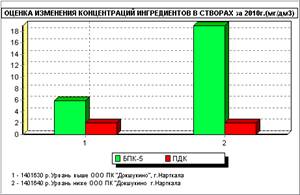 Качество воды реки Урвань, которая является протокой реки Черек, исследуется в 4-х створах: 1) выше сброса сточных вод МП «Горводоканал» г.о. Нальчика 2) ниже сброса сточных вод МП «Горводоканал» г.о. Нальчика 3) выше сброса сточных вод ООО ПК «Докшукино» 4) ниже сброса сточных вод ООО ПК «Докшукино». Кислородный режим и водородный показатель воды в первых двух створах удовлетворительные. В отчетном году выявлено влияние недостаточно очищенных сточных вод МП «Горводоканал» г. Нальчика на качество воды в реке по легкоокисляемым органическим загрязнителям: БПК5 – 2,8 ПДК, перманганатная окисляемость – 1,2 ПДК, ХПК – от 10 до 82,3 мг/дм3. Концентрация фосфатов в течение всего года превышала ПДК и колебалась от 0,27 мг/дм3 до 0,98мг/дм3 (4,9 ПДК), концентрация нитрит-иона составляла от 0,21мг /дм3 (2,6 ПДК) до 1,12 мг /дм3 (14 ПДК). Выявлено также превышение концентрации нефтепродуктов в среднем до 0,07 мг /дм3 (1,4 ПДК), что соответствует прошлогодним значениям. Качество воды данного створа, как и в прошлом году, соответствует III классу – умеренно загрязнённая. Ниже по течению река принимает недостаточно очищенные стоки ООО ПК «Докшукино», что ухудшает качество воды в реке Урвань. В створе наблюдения (х. Колдрасинский) физические и органолептические свойства воды неудовлетворительные. В толще воды наблюдаются хлопьевидные взвеси, слизистые обрастания на камнях и на дне реки. Вблизи водоёма чувствуется сильный запах барды, переходящий в жаркое время года в гнилостный. По легкоокисляемым органическим соединениям качество воды остаётся на уровне прошлогодних значений: БПК5 от 4,3 мг /дм3 до 53,9 мг /дм3 (26,9 ПДК), величина перманганатной окисляемости варьировала в течение года от 4,4 мг /дм3 до 34 мг /дм3, ХПК от 17,5 мг /дм3 до 83,3 мг /дм3. (рис.6)