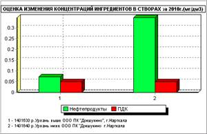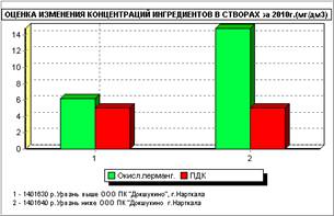 Выявлено также повышение среднегодовых концентраций нитрит-иона (9,5 ПДК), фосфатов (6,2 ПДК), нефтепродуктов (6,97 ПДК) (рис.7). Всё это указывает на загрязнение водотока органическими соединениями, содержащимися в отходах спиртовых производств. Качество воды данного створа соответствует IV классу – грязная.