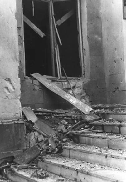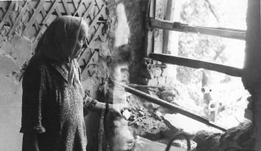 Пенсионерка М.Ф. Родина чудом осталась жива после прямого попадания снаряда в квартиру, май 1992 г.