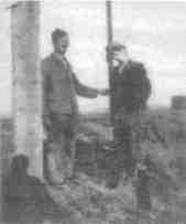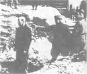 Коллективная фотография военнослужащих вермахта. На вытащенной из школьного класса доске - квинтэссенция нацистской философии: «Русский должен умереть, чтобы мы жили» тов»: коммунистов, большевиков, евреев и всех, кого заблагорассудится. Каждой группе армий было придано по айнзатцгруппе, а в полосе группы армий «Юг» их действовало целых две. Взаимопонимание между армейским командованием и карателями было самым нежным. Об этом с удовольствием вспоминал впоследствии командир айнзатцгруппы «А» бригаденфюрер СС Франц Штальэккер. «Айнзатцгруппа «А» после подготовки ее к операциям направилась в район, где она должна была сосредоточиться, как приказано, 23 июня 1941 г. — на второй день кампании на Востоке. Группа армий «Север», состоящая из 16-й и 18-й армий и 4-й танковой группы, вышла перед этим днем, — писал в докладе Штальэккер. — Нашей задачей было немедленно установить личный контакт с командующими указанных армий и командующим тыла. Следует подчеркнуть с самого начала, что сотрудничество с вооруженными силами обычно было очень положительным; в некоторых случаях, например с 4-й танковой группой, которой командовал генерал-полковник Гёппнер, это сотрудничество было очень тесным. Некоторое взаимное непонимание, которое существовало в первые дни с некоторыми деятелями, потом совершенно рассеялось в результате личных собеседований»1. Не менее тесным было взаимопонимание между командованием группы армий «Юг» фельдмаршала фон Рундштедта и приданной ей айнзатцгруппой «С» бригаденфюрера Отто Раша2. Благодаря этому на Украине расстрелы мирных жителей происходили с регулярностью хорошо отлаженных часов. Командир переброшенного с Запада 528-го пехотно- 1 МНП. Вар. 1. Т. 7. С. 307—308, 727. См. также: Хаупт В. Группа армий «Север»: Бои за Ленинград, 1941—1944 / Пер. с англ. Е.Н. Захарова. — М.: Центрполиграф, 2005. — С. 337. 2 Штрайт К. Солдатами их не считать: Вермахт и советские военнопленные в 1941—1945 гг. / Сокр. пер. с нем. — М.: Прогресс, 1979. - С. 50. го полка майор Рёйснер услышал характерные винтовочные залпы уже в день прибытия в Житомир. Заинтригованный, вместе с двумя адъютантами он отправился выяснять, в чем дело. «Вскоре, — вспоминал майор, — мы почувствовали, что здесь происходит что-то ужасное». Офицеры убыстрили шаги; выстрелы раздавались из-за железнодорожной насыпи. Когда майор взобрался на насыпь, то увидел, как рассказывал впоследствии, «отвратительную по своей жестокости картину, потрясавшую и ужасавшую неподготовленного человека». За насыпью была вырыта яма около 7—8 метров длиной и примерно 4 метра шириной, на одном краю которой лежала куча вынутой из нее земли. Холм и прилегающая к нему стенка ямы были залиты потоками крови, а сама яма — завалена множеством трупов мужчин и женщин. Сколько людей лежало в яме, понять было невозможно. Подойдя вплотную к яме, майор увидел лежавшего среди других расстрелянных старика с седой окладистой бородой. Он был еще жив и тяжело дышал. «Я ему уже вогнал семь пуль в живот, теперь он сам должен подохнуть», — с улыбкой объяснил майору один из полицейских. Рёйснер подал командованию возмущенный протест. «Я участвовал в Первой мировой войне, во французской и русской кампаниях этой войны и отнюдь не страдаю преувеличенной чувствительностью, — писал майор. — Мне пришлось быть свидетелем многих более чем неприятных ве