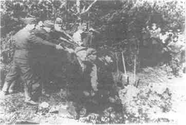 прост: он заключался в проведении массовых акций уничтожения. Жестокость по отношению к местным становилась привычной. «Акции проходят везде одинаково, и к этой работе быстро привыкаешь, — вспоминал полицейский 105-го резервного батальона. — Повсюду сгоняют людей, потом их проверяют, спрашивают о партизанах, а всех подозрительных забирают. Чаще всего эти акции проходят безрезультатно, так как партизаны живут не в деревнях, а где-то в лесу»1. Для того чтобы понять, что стоит за этими бесстрастными строчками, следует обратиться к свидетельствам «другой стороны». Вот рассказ командира подразделения Красной Армии, попавшего в окружение и пробивавшегося к своим. Рассказ об ординарной трагедии, свидетелями которой стали «окруженцы». 1 Война Германии против Советского Союза. С. 129. «Подошли мы к Ольховке. А в это время там находилась группа фашистских карателей. Как потом выяснилось, предатель выдал командира партизанского отряда, который заночевал в своей родной семье. Командиру удалось бежать, но в руки палачей попали его жена и ребенок. Жену немцы начали пытать, издеваясь над ребенком. В конце концов палачи эту девочку закололи, а жена сошла с ума. Как только узнал я об этом, немедля ударил всей нашей силой по селу и, честно говоря, за ребенка я ни одного из них не пощадил, побили всех до единого!»1 Немецкий хирург Ханс Киллиан не видел убийства детей, однако и расстрелы так называемых «партизан» произвели на него не менее удручающее впечатление. «Медленно Густель проезжает мимо бревенчатых домов. Вдруг мы замечаем группу эсэсовцев в плащах с автоматами и карабинами в руках. Они охраняют несколько русских мужчин, выстроенных в ряд с поднятыми вверх руками, лицом к стене. Я обращаюсь к одному эсэсовцу: — Что здесь происходит? Кто эти люди? — Партизанские свиньи, — раздается в ответ, — сейчас мы их уложим. И парень ухмыляется так, словно все это доставляет ему удовольствие. К горлу подкатил комок. Я тороплю Густеля ехать подальше отсюда»2. Гражданское население смотрело на происходящее с ужасом; казалось невероятным, что подобная жестокость вообще может существовать. В селе Агрофеновке Ростовской области каратели арестовали все мужское население от 16 до 70 лет и каждого третьего расстреляли3. В деревне Басманово Смоленской области немцы 1 Сквозь огонь великой битвы: Устное народное творчество нижегородцев времен Великой Отечественной войны / Сост., предисл., примеч. В.Н. Морохина. Нижний Новгород, 1995. — С. 78. 2 Киллиан X. В тени побед. С. 79. 3 МНП. Вар. 1.T. 5. С. 96. «выгнали в поле более 200 школьников, прибывших в деревню на уборку урожая, окружили их и перестреляли. Большую группу школьниц они вывезли в свой тыл «для господ офицеров»1. Деревня Перелом Тосненского района в сентябре была оцеплена немецкими солдатами. Каратели собрали мужчин и начали их избивать, требуя выдачи партизан. Немцы приехали со списком деревни, в который были включены местные жители, ушедшие в партизаны, и коммунисты. Жен коммунистов жгли живьем в избах2. 285-я охранная дивизия уничтожила полторы тысячи «партизан»; собственные потери составили 7 убитых и 11 раненых. 707-я пехотная дивизия за месяц расстреляла в Белоруссии 10 431 человек, потеряв при этом 2 человек убитыми и 5 ранеными. Части охраны тыла группы армий «Юг» за такой же период расстреляли около 2,4 тысячи человек, потеряв 7 