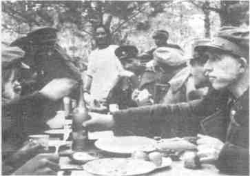 «На Востоке мы, несомненно, столкнулись с чудовищно упорным сопротивлением, — писал министр восточных территорий Розенберг. — Это едва ли можно рассматривать иначе, чем обычное, старое славянское упрямство, связанное с фанатичным мировоззрением. Это мировоззрение... им довольно равномерно проникнуто русское население сверху донизу, причем проводником его является большевистская партия. Эти люди действительно верили, что они могут принести спасение миру, что они самые передовые люди и обладают самой прогрессивной системой в Европе... Можно думать об этом и расценивать это как угодно, во всяком случае, нам противопоставлена сила»2. 1 Антипартизанская война... С. 81—82. 2 МНП. Вар. 1. Т. 4. С. 663. ...В нескольких десятках километров от места дислокации 703-го охранного батальона партизаны соединений генералов Федорова и Бегмы вошли в большое село, находившееся на контролируемой оккупантами территории. До партизанского края было далеко; однако партизан здесь встретили хлебом и солью. В дневнике уже встречавшегося нам Михаила Глидера осталась зарисовка этой встречи. «Навстречу нам вышли старики, женщины и дети. Старики несли поднос с хлебом-солью, накрытый белой салфеткой. Федоров, Бегма, Дружинин и комиссар Бегмы Кизя сошли с коней, подошли к старикам, сняв фуражки, поблагодарили за встречу. Затем состоялся митинг. Открыл его священник Михаил Грибинка. Я записал несколько фраз из его речи. — Отрадно и радостно душе смотреть на боевые дела народных мстителей. Не немец ищет партизана, а партизан — немца. Вы для нас — советская власть. Вы для нас — православное воинство. Вы для нас — Россия. Вы защитники наши, вы лучшие дети наши. Слава вам, герои родины, слава вашим командирам, слава отцу народа нашего — Сталину. Примите наш земной поклон за то, что не дали родину на поругание, за то, что скоро вызволите нас из рабства... Когда мы решили ехать дальше, оказалось, что дорога закрыта: улица перегорожена столами. Хозяйки вынесли столы, накрыли их белыми скатертями, и каждая старалась, чтобы ее стол был красивее и богаче других. Старики пригласили всех нас на обед. ...Вскоре все перемешалось. Партизаны подсели к местным девушкам, местные парни окружили наших партизанок. Только старики и священники чинно беседовали с нашими командирами. После обеда начались танцы. Партизаны плясали только с местными девушками, а партизанки — с местными парнями. Я видел, как трудно было Федорову удержаться, чтобы не