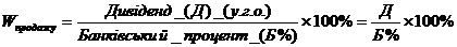 6.1. Номінальна вартість акцій дорівнює 100 у.г.о. Власник цієї акції отримує дивіденд у розмірі 3 %. Яким буде продажний курс акцій, якщо позичковий процент складає 6 %? Вирішення і пояснення задачі Акція - цінний папір без установленого строку обігу, що засвідчує дольову участь у статутному фонді акціонерного товариства, підтверджує членство в акціонерному товаристві та право на участь в управлінні ним, дає право його власникові на одержання частини прибутку у вигляді дивіденду, а також на участь у розподілі майна при ліквідації акціонерного товариства. Акції можуть бути іменними та на пред'явника, привілейованими та простими. Громадяни вправі бути власниками, як правило, іменних акцій. Обіг іменної акції фіксується у книзі реєстрації акцій, що ведеться товариством. До неї має бути внесено відомості про кожну іменну акцію, включаючи відомості про власника, час придбання акції, а також кількість таких акцій у кожного з акціонерів. По акціях на пред'явника у книзі реєструється їх загальна кількість. Привілейовані акції дають власникові переважне право на одержання дивідендів, а також на пріоритетну участь у розподілі майна акціонерного товариства у разі його ліквідації. Власники привілейованих акцій не мають права брати участь в управлінні акціонерним товариством, якщо інше не передбачено його статутом. Привілейовані акції можуть випускатися із фіксованим у процентах до їх номінальної вартості щорічно виплачуваним дивідендом. Виплата дивідендів провадиться у розмірі, зазначеному в акції, незалежно від розміру одержаного товариством прибутку у відповідному році. У тому разі коли прибуток відповідного року є недостатнім, виплата дивідендів по привілейованих акціях провадиться за рахунок резервного фонду. Якщо розмір дивідендів, що виплачуються акціонерам, по простих акціях перевищує розмір дивідендів по привілейованих акціях, власникам останніх може провадитися доплата до розміру дивідендів, виплачених іншим акціонерам. Привілейовані акції не можуть бути випущені на суму, що перевищує 10 процентів статутного фонду акціонерного товариства. Порядок здійснення переважного права на одержання дивідендів визначається статутом акціонерного товариства. Курс акції на фондовій біржі визначають, в першу чергу, розмір її дивіденду та існуючий банківський (позиковий) процент. Скористаємося формулою Wпродажу для простої акції: