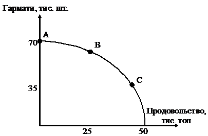 а) яку технологію обере підприємство, якщо воно зацікавлене у використанні меншої кількості ресурсів? б) яку технологію обере підприємство, якщо воно має за мету отримати найбільший прибуток? в) припустимо, що ціна ресурсу “капітал” зменшилася до 15 грн. за одиницю, а ресурсу “земля” зросла до 10 грн. за одиницю. Як зміниться вибір підприємства? 8. Виконуючи завдання Центру, штандартерфюрер Штірліц, він же полковник Ісаєв, дізнався, що точки А, В та С належать кривій виробничих можливостей ворога. Крім того, він дізнався, що генеральний штаб ворога планує виробити 70 тис. гармат. Штірліц відправляє шифровку до Центру: «Юстас Алексу. Мій прогноз – перемога в наших руках, ворог знаходиться в точці А».