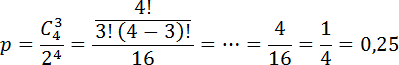 Таким образом, для решения задачи с монетами нужны два числа: число бросков и число орлов. Чаще всего эти числа даны прямо в тексте задачи. Более того, не имеет значения, что именно считать: решки или орлы. Ответ получится один и тот же. На первый взгляд, теорема кажется слишком громоздкой. Но стоит чуть-чуть потренироваться — и вам уже не захочется возвращаться к стандартному алгоритму, описанному выше. Задача [Рабочая тетрадь «ЕГЭ 2012 по математике. Задачи B10»] Монету бросают четыре раза. Найдите вероятность того, что орел выпадет ровно три раза. Решение По условию задачи, всего бросков было n = 4. Требуемое число орлов: k = 3.Подставляем n и k в формулу: