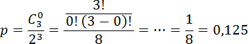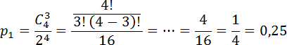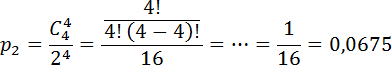 Теперь найдем p 2 — вероятность того, что орел выпадет все 4 раза. В этом случае n = 4, k = 4. Имеем: