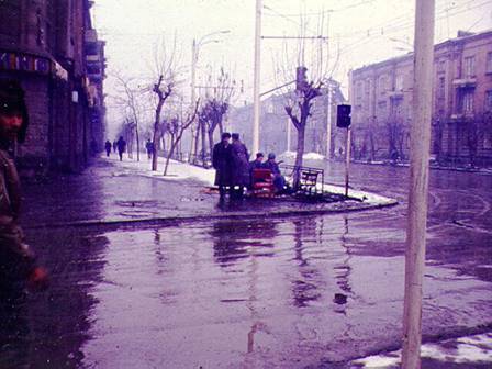 А мы с Юрой и Шынгысом в это время вели поиск руководства. Штаб Минлегпрома оказался пуст. В штабе ВЛКСМ занимаются только комсомольскими отрядами. В Центральном штабе никто ничего не знает. Никто не может направить нас на объект, никто не может сказать, где и что нужно делать. Нет связи между штабами. Нет связи с Ереваном, с другими районами. Единственное, что узнали, так это что Казахстанские отряды стоят у памятника матери Армении, спелеологи в большинстве на стадионе. Но все это далеко. Наша база в центре города, может, и не самая безопасная, но уж в удобстве ей не откажешь. У дверей Центрального Штаба автоматчики в бронежилетах и касках, усиленные наряды милиции. На всех стенах и окнах объявления: