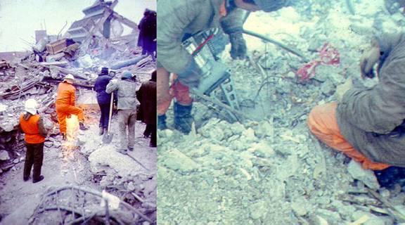 Рядом с нами работают спасатели из Чехословакии. Они приезжают на специальных машинах типа ГАЗ-66 командами по 8 человек, портативными мотодискорезами режут арматуру, поднимают гидравлическими домкрат-разжимами плиты, перекусывают специальными пресс-ножницами путаницу стали. Присоединяемся к ним с лопатами и ломами - все наше шанцевое снаряжение.