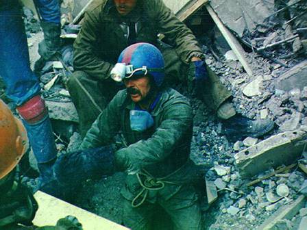 Олег Гвоздев: “...Девятиэтажка сложилась, как карточный домик, как будто под гигантским прессом, расплющив все и всех между полом и потолком собственных квартир. Все засыпано горами битого строительного материала. Собираем его в контейнер и отправляем на кране вниз. Очень мешает переплетение арматуры. Режем ее газосваркой. Работа утомительная. Надо очистить плиты перекрытий и поднять их краном, открыв путь к следующему этажу. Мужики отрыли узкую щель, ведущую внутрь здания. Юрий полез туда, прошел сверху (6 этажей) до подвала, где можно, но ни мертвых, ни живых не обнаружил. Из-под руин ощутимо тянет разложением".