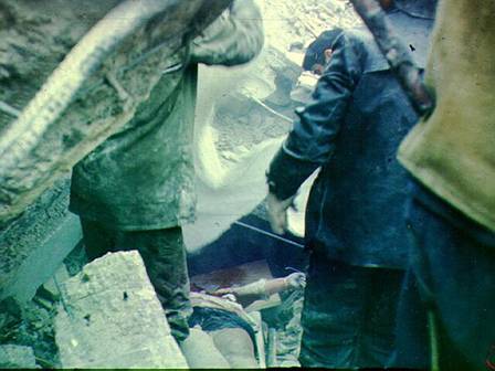Сергей Хардиков: "На месте дома здоровенная куча бетонных глыб, балок, щебня и завязанной узлом арматуры. Высота кучи - метров 10-15 (это Серега загнул - реально метров 5-6). По куче копошится человек 60-80. Мы лезем на кучу и начинаем бестолково шпырять ломами и грести лопатами. Вокруг дома стоит 4 подъемных крана. Стропим балки, сварщики обрезают арматуру, кран грузит балки и глыбы на подъезжающие КамАЗы. Мелкие обломки собираем в тазики и корыта, которые затем высыпаются в здоровенный железный ящик. Периодически содержимое ящика высыпается с помощью того же крана".