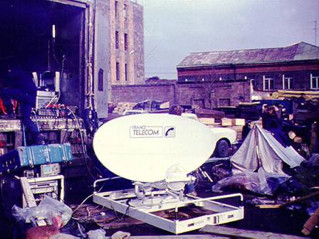 Французские мобильные станции теле трансляции в Ленинакане Олег Гвоздев: "Французы вытащили из чрева фургона горы аппаратуры. Один с видеокамерой на плече сразу ринулся нас снимать. Оказывается, это будет сеанс космической связи с Парижем!"