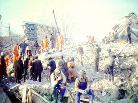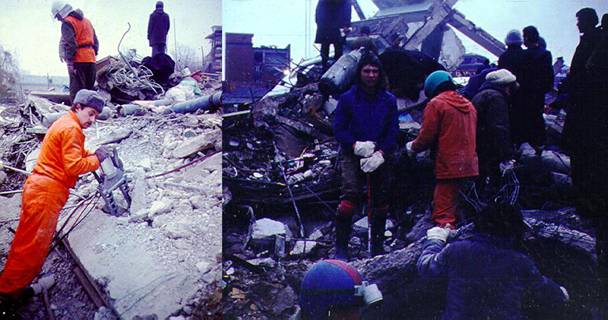 На нашем объекте мечется один беспокойный старик. На 5-м этаже именно в этом подъезде завалило его дочь. Старик зорко бдит, чтобы мы ни на метр не отклонились от этого пролета здания: - Эй, там не копай, там нет людей, здесь копай! "Если бы там кто-то жил, то здесь были бы и родственники. Вот я уже девятый день здесь копаю, потому что здесь моя дочь! Но почему-то именно там, где "никто не жил" мы откопали 2 трупа - девочка с раздавленной головой и мужчина. От трупного запаха я чуть не обрыгался и спешно ретировался. Потом долго казалось, что респиратор впитал этот запах и сам пахнет мертвечиной. Тошно. Сегодня с нами опять работали пожарники из Чехословакии. Вот это конкретные ребята. У них бензиновые дисковые пилы, которые берут не только любую арматуру, но и бетон. Спец.клещи для перекусывания тонкой арматуры, пневмодомкраты. Вот они дело делают. А мы только ломами тюкаем, да лопатами мелкие обломки сгребаем. Обидно".