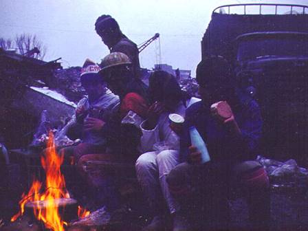Сергей Хардиков: "Папаша" (наш покровитель) организовал нам горячий обед: - курица, каша с тушенкой, чай плюс сухпай: сыр, колбаса, хлеб. Причем не пара примитивных термосов. Он пригнал трейлер, как он сам говорит: - Ради вас - всех накормим. По 30 паек - таких порций не было, пришлось взять 500. Организовал он нам и 600 пачек сигарет: - Это вам на неделю. Потом будет еще. Размах его меня потрясает. Само собой, что как только мы дойдем до 3 этажа и откопаем его дочь, все эти горячие обеды исчезнут вместе с "папой". Тут каждый печется только за своих родных. На соседей ему плевать.