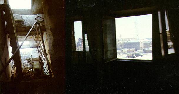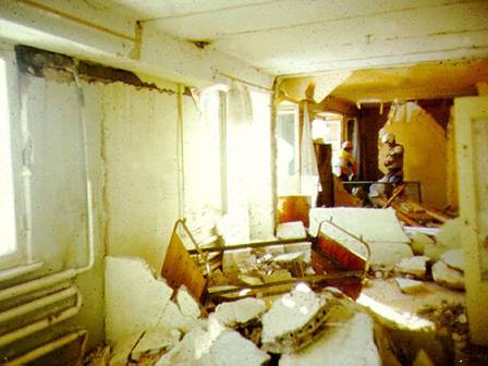 Сергей Хардиков: "Сегодня делимся на 2 группы. Часть идет на руины, а часть в штаб на раскомандировку. Мы с Шефом, Ваном, Соломой идем на раскомандировку. Нас направляют снимать мебель с верхних этажей аварийных зданий. Встречаем ребят-альпинистов из Минска, они уже работали на спуске вещей и говорят, что доходит до абсурда. Сначала просят спустить документы, фотографии, ценные вещи, потом мебель, а потом дело доходит и до компотов. Так оно и у нас получилось. Берем в штабе заказ на снятие вещей. Приезжаем. Квартира на 5-м этаже. Хозяин уже снял все ценное, включая мебель, нам осталась мелочевка, тот самый пресловутый компот (банок 40-60). Наконец, мне удалось посмотреть, что собой представляют эти самые 9-этажные дома. Нет ничего удивительного, что они рассыпаются в прах. Шлакоблоки, не скрепленные ничем. Ужас. Кругом солидные трещины, часть лестничных пролетов упала".