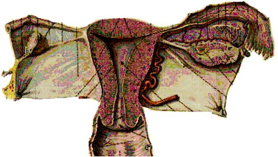Влагалище - мышечно-фиброзная трубка длиной около 7 см., которая верхним концом охватывает шейку матки, а нижним открывается в половую щель. Стенки влагалища состоят из трех слоев: слизистой оболочки, мышечного слоя, окружающей клетчатки. Слизистый слой образует множество поперечных складок, что определяет растяжимость стенок влагалища во время родов. Железы в слизистой оболочке отсутствуют. Содержимое влагалища небольшое за счёт пропотевания жидкости из сосудов и присоединения секрета шеечных маточных желез. Эти выделения у здоровой женщины имеют слизистый характер, молочный цвет, характерный запах и кислую реакцию. Такая реакция обусловлена жизнедеятельностью влагалищных бацилл (палочек Додерлейна), образующих молочную кислоту. Кислая среда способствует гибели патогенной микрофлоры и самоочищению влагалища. В соответствии с характером микрофлоры различают 4 степени чистоты влагалищного содержимого: I степень - только влагалищные бациллы и эпителиальные клетки. Реакция кислая. II степень - бацилл меньше, появляются лейкоциты, бактерии в незначительном количестве (сапрофиты). Реакция кислая. III степень - мало влагалищных бацилл, преобладают другие виды бактерий. Реакция слабо щелочная. IV степень - влагалищных бацилл нет, много патогенных микробов и лейкоцитов. Реакция щелочная. III и IV степени чистоты говорят о патологических процессах. Матка - непарный полый мышечный орган, в полости которого поступившая через маточную трубку яйцеклетка в случае оплодотворения подвергается дальнейшему развитию, вплоть до родов. Матка расположена в полости малого таза, между мочевым пузырем и прямой кишкой, по форме напоминает грушу. Различают тело, перешеек и шейку, которая заходит в верхнюю часть влагалища, образуя сводчатые углубления - своды влагалища: передний, задний, правый и левый. В заднем своде скапливается семенная жидкость при половом сношении. Внутри шейки матки имеется узкий (цервикальный) канал, его верхний конец - внутренний зев - переходит в канал перешейка; наружный зев открывается в центре влагалищной части шейки. Стенка матки представлена 3 слоями: внутренним – слизистой оболочкой (эндометрий), средним – мышечным (миометрий), наружным - серозным (периметрий). Слизистая оболочка тела матки гладкая, а в шеечном канале образует складки, слой, прилежащий к миометрию, называется базальным, а тот, что смотрит в полость матки - функциональным и подвергается циклическим изменениям, связанным с менструацией. Длина матки 6 - 7,5 см, длина шейки 2,5 см. При беременности матка увеличивается в размерах, растягивая мышечный слой, и меняет свою форму - становится круглой.