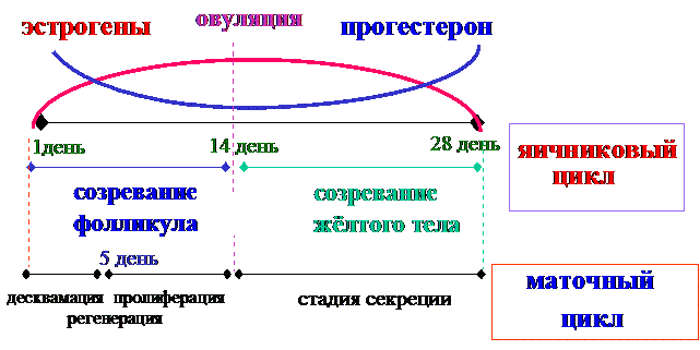 "РЕПРОДУКТИВНАЯ СИСТЕМА МУЖЧИНЫ И ЖЕНЩИНЫ В ЗРЕЛОМ ВОЗРАСТЕ. ПРОЦЕС ВОСПРОИЗВОДСТВА". I. ВВЕДЕНИЕ (мотивация цели). Знание вопросов строения и функции репродуктивной системы необходимо каждому человеку зрелого возраста для грамотной организации образа жизни. Это позволит обеспечить более высокий уровень не только настоящего, но и будущего поколения. Задача медицинских работников пропагандировать эти знания среди населения, поэтому твердое усвоение основных положений темы имеет важное значение в подготовке высококвалифицированного специалиста. II. ОБЩАЯ ЦЕЛЬ. Углубить и расширить знания, полученные на теоретическом занятии. Студенты должны уметь сделать сообщения по вопросам темы, развивая свое мышление, речь, умение работать с литературой. III. УЧЕБНО - ЦЕЛЕВЫЕ ЗАДАЧИ. В результате подготовки к занятиям студенты должны: А.ЗНАТЬ: 1. Строение и функции внутренних половых органов женщин. 2. Строение и функции наружных половых органов женщин. 3. Строение и функции мужских половых органов. 4. Понятие о циклических изменениях в организме женщины. 5. Яичниковый цикл (фазы, морфологические изменения, гормональный фон, действие гормонов). 6. Маточный цикл (регуляция, стадии морфологических изменений). 7. Половые гормоны, их биологическое действие на мужской и женский организмы. 8. Женский таз (строение, размеры). 9. Гигиена менструального периода. 10. Отрицательное влияние факторов окружающей среды на половые железы, их функцию, фертильность. 11. Роль медработника в оказании консультативной помощи по вопросам укрепления репродуктивного здоровья. Б. УМЕТЬ: 1. Обучить женщину вести менструальный календарь. 2. Вычислять фертильные дни по менструальному календарю. 3. Проводить беседы «Гигиена половых органов», «Гигиена менструального цикла». IV. МЕТОДИЧЕСКИЕ РЕКОМЕНДАЦИИ СТУДЕНТАМ ДЛЯ ОТРАБОТКИ УЧЕБНО - ЦЕЛЕВЫХ ЗАДАЧ. (План изучения темы). 1. Строение половых органов. При изучении этого раздела следует обратить внимание на расположение матки, яичников, маточных труб в малом тазу, поддерживающий и фиксирующий аппарат связок, строение мышц тазового дна. При изучении строения мужских половых органов следует разобраться в строении семявыводящего протока (места впадения выводных протоков желез). Указанные вопросы можно найти в литературе. п.1 - стр. 44 - 51, п.2 - стр. 12 -23. 2. Функции половых органов. Основной вопрос этого раздела - это менструальный цикл. Необходимо четко уяснить соответствие фаз яичникового цикла и стадий маточного (фолликулярная - пролиферация и лютеиновая - секреция). Изменение количества эстрогенных гормонов в зависимости от фазы яичникового цикла, их влияние на организм. Для облегчения усвоения целесообразно представить схему: