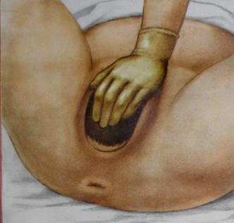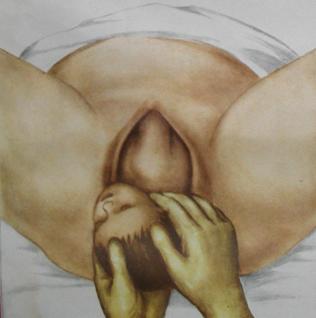 Рис. 23. Предупреждение преждевременного разгибания головки. Акушерка, стоя справа от роженицы, кладёт ладонь левой руки на лобок, пальцы на головку, препятствует быстрому продвижению и преждевременному разгибанию головки.