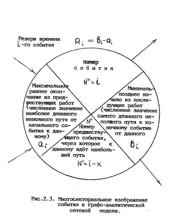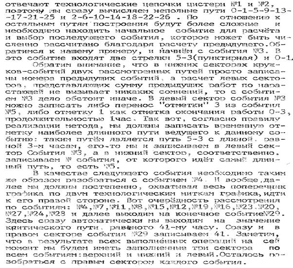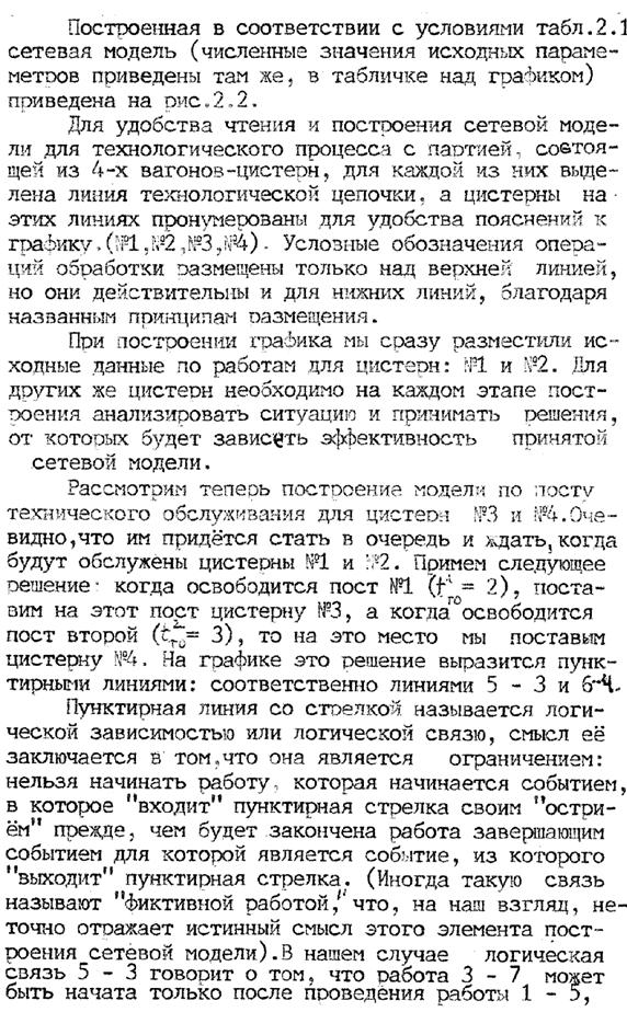 Приведенный график представляет простую сеть, где в квужках обозначены номера событий: №1 - начальное событие, 21 - конечное событие, остальные - промежуточные события. Каждое из промежуточных событий фиксирует окончание предыдущей работы, и, одновременно начало последующей работы. Работы обозначаются стрелками в направлении от начальномго события к завершающему событию. Под стрелками подписана продолжительность каждой работы. Над стрелками обычно надписываются наименования работ или их условные обозначения. Рассмотрим теперь более сложную конструкцию графика, исходя из моделирования более сложного технологического процесса, где возможны различные варианты принятия решений, результаты их не всегда очевидны. В нашем примере предприятие-поставщик заинтересовано в ускорении оборота своего собственного парка вагонов-цистерн. которые, по прибытию, проходят сложную технологическую обработку после очередного рейса, а затем становятся под погрузку, а после этого уходят в очередной рейс. Пример построен для группы, состоящей из четырёх вагонов, в задании на разработку сетевой модели исзодные данные будут другие, согласно индивидульного номерного варианта (таблица данных 2.3. - в конце раздела, обозначения и сведения о технологических постах в табл. 2.1.).
